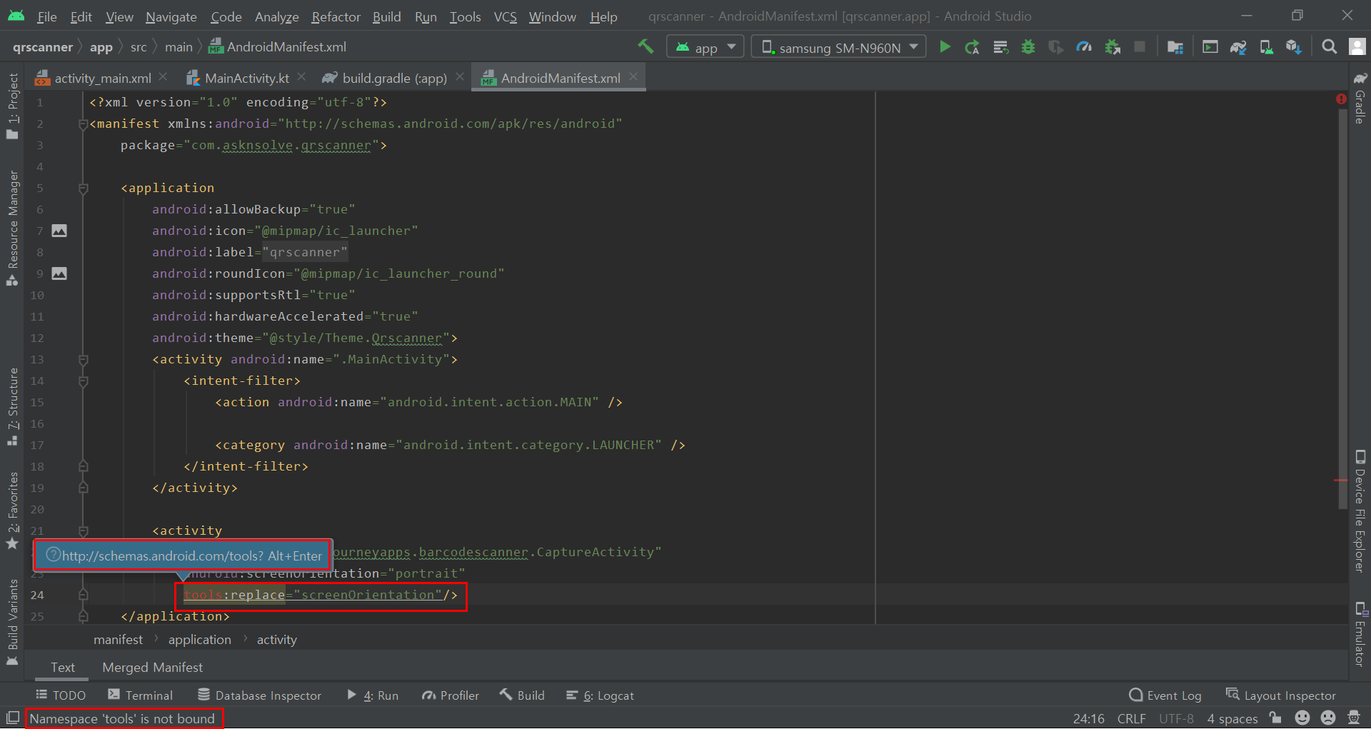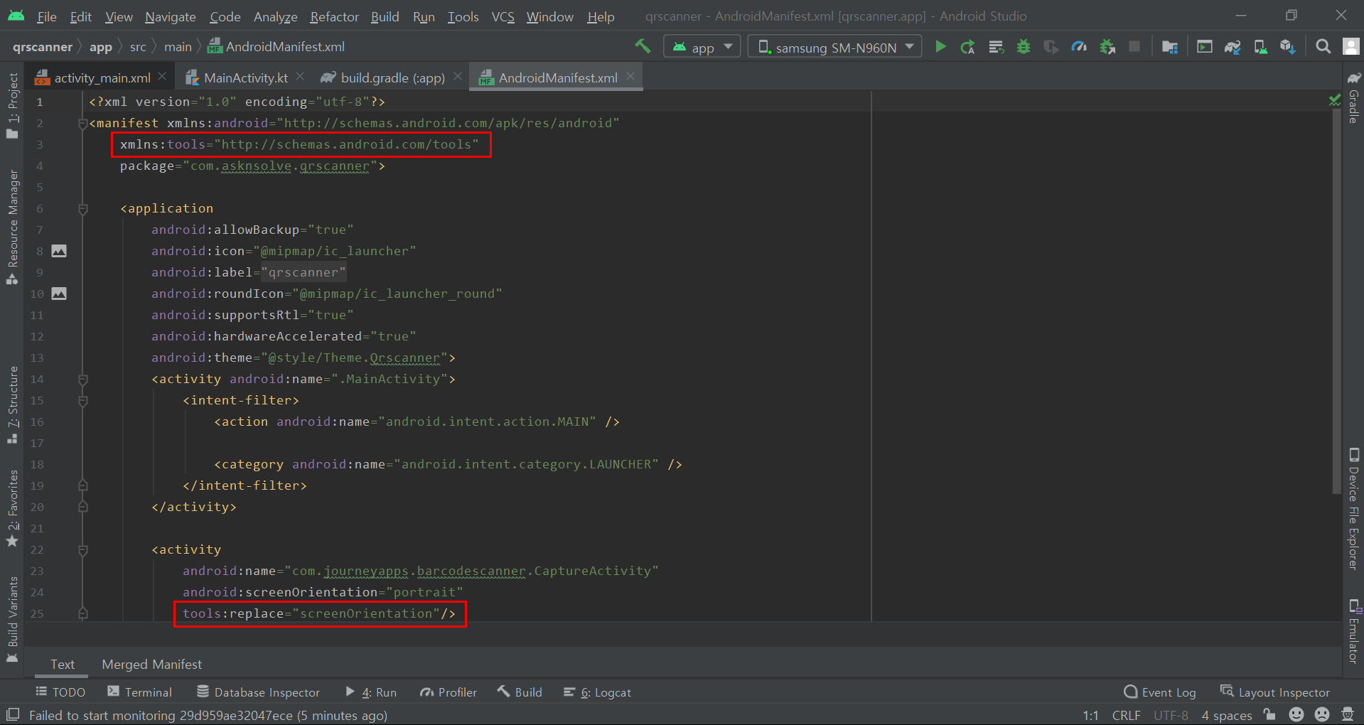 tools:replace="screenOrientation"을 추가하는데 error 발생...